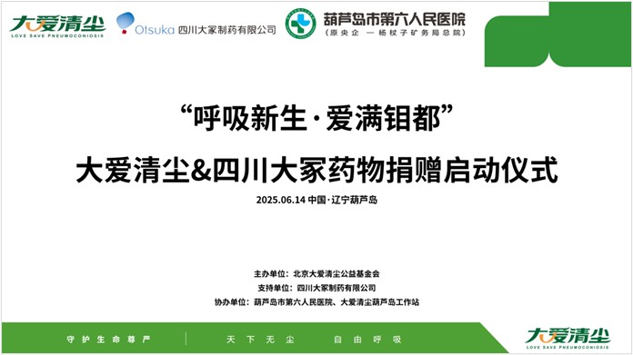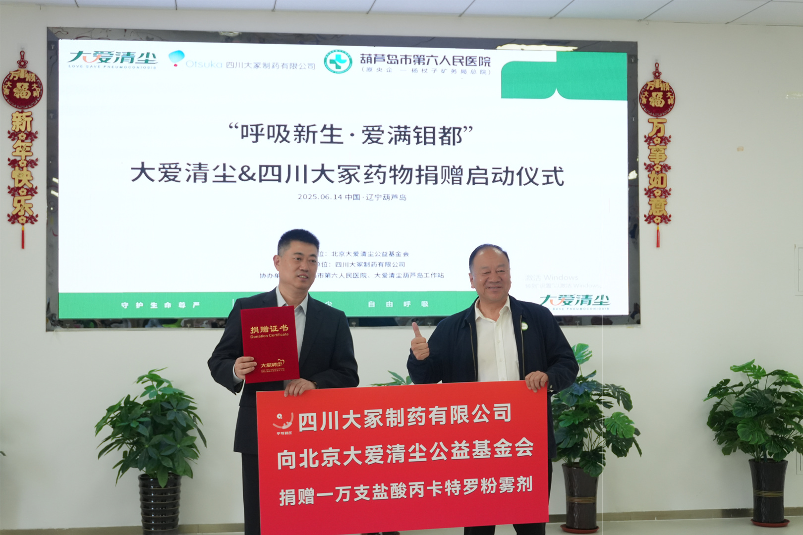 2025年6月14日,“呼吸新生•爱满钼都”——北京大爱清尘公益基金会与四川大冢制药有限公司在辽宁省葫芦岛市第六人民医院开展的药物捐赠启动仪式顺利举行。本次四川大冢通过大爱清尘向尘肺病患者捐赠10,000支盐酸丙卡特罗粉雾剂,以帮助他们缓解呼吸之痛、减轻用药负担。首批3,000支药物已定向送达葫芦岛地区,预计惠及当地约1,000名患者。