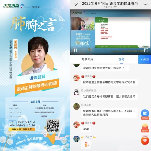 为了帮助尘肺病病友们更好地进行自我健康管理,活动还安排了患者教育环节,由山东省职业病医院的邹主任带来了《谈谈尘肺的康养与用药》的科普讲座。在讲座的最后,邹主任介绍了此次四川大冢捐赠的盐酸丙卡特罗粉雾剂的用药时机和用药提醒,并由六院的护士携一位尘肺病患者进行现场演示。此次讲座也在线上进行了同步直播,有2,736人次观看学习并留言提问互动。